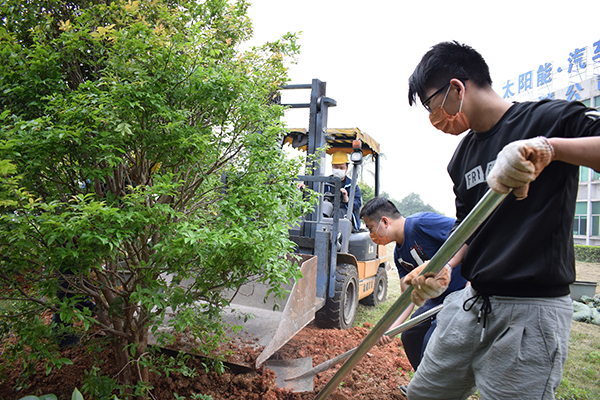 “树坑要挖深一点,草屑要铺均匀,袋装的肥土均匀下在底部,填土时要把树扶正,土一定要压实……”在有经验的志愿者讲解和指导下,平日里专注于产线的工人们,瞬间变成了一个个种树能手。每个工序都一丝不苟,挖坑、施肥、填土、浇水,严谨到位。虽然挥汗如雨,但却干劲十足。志愿者们这次栽种的是嘉宝果树,由于树苗较大较重,平时工作中的老伙计——叉车也出动了。几个小时后,仕诚公司的草坪上,又翻出了许多新土,也增添了一排整齐翠绿的果树。迎着春日的暖阳,志愿者们在新种的果树前留下了美丽瞬间。